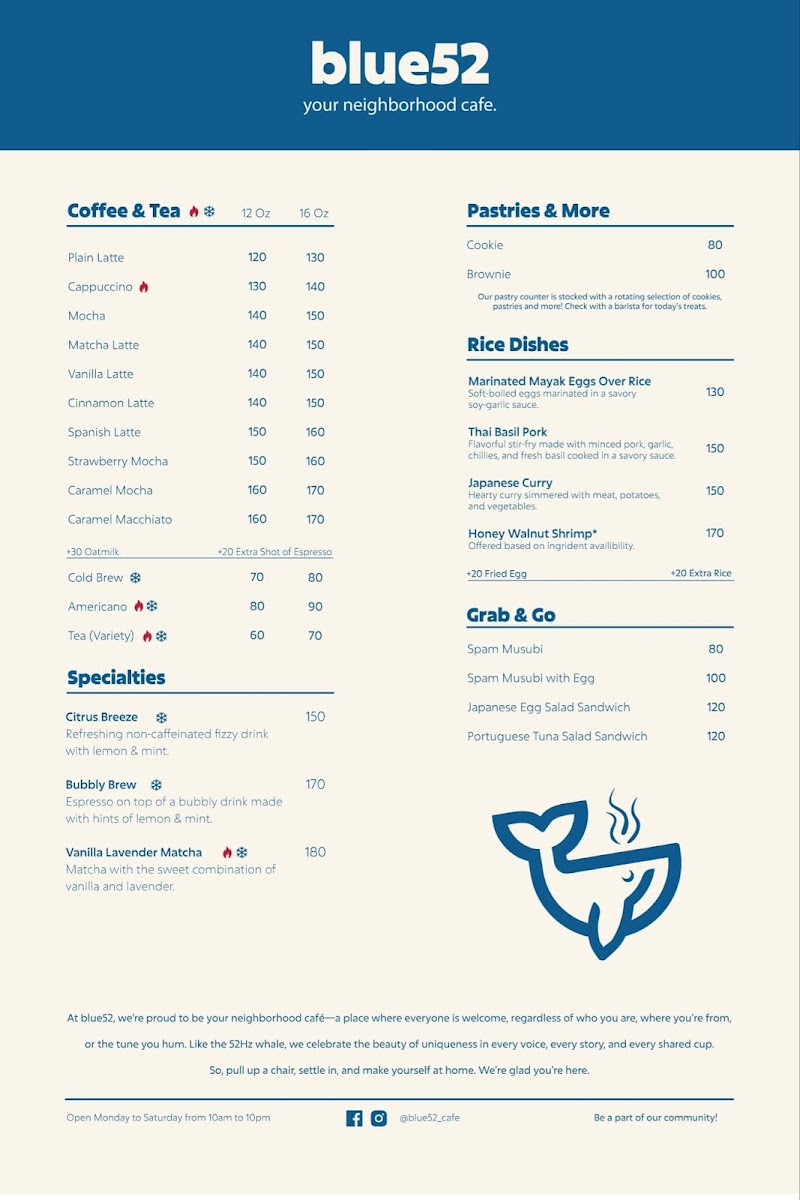 The menu at Blue52 Cafe offers a variety of food and drink options suitable for different times of the day, including breakfast, casual meals, and coffee breaks. Visitors can expect a selection of coffee beverages as well as other specialty drinks such as the Bubbly Brew. The food offerings include light meals and snacks, with options encompassing dishes such as Japanese curry and dishes influenced by Thai and other Asian cuisines.
